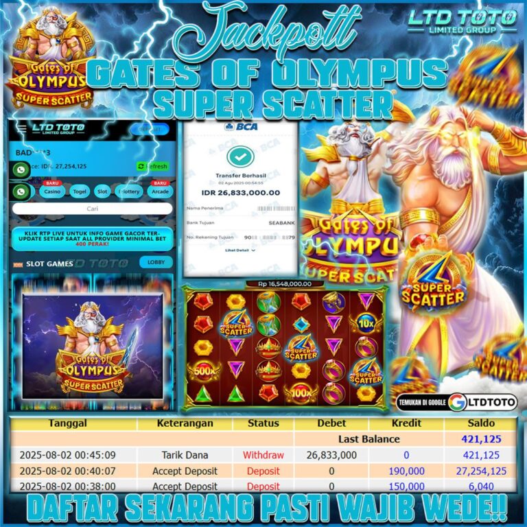 LTDTOTO JACKPOT OLYMPUS SUPER SCATTER RP 26.833.000 SABTU 02 AUGUST 2025 Selamat kepada User id : BAD***3 Telah berhasil mendapatkan kemenangan besar pada permainan OLYMPUS SUPER SCATTER, kemenangan Sebesar Rp.26.833.000, Setelah mengisi formulir withdraw dengan kurang waktu hanya 5 – 10 menit pihak LTDTOTO sudah melakukan transfer kepada pemilik User id dan dana sudah dapat di cairkan…