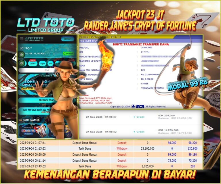 LTDTOTO JACKPOT SLOT RAIDER JANES CRYPT OF FORTUNE RP 23.000.000 RABU 24 SEPTEMBER 2025 Selamat kepada User id : LO**PO** Telah berhasil mendapatkan kemenangan besar pada permainan RAIDER JANES CRYPT OF FORTUNE, kemenangan Sebesar Rp.23.000.000, Setelah mengisi formulir withdraw dengan kurang waktu hanya 5 – 10 menit pihak LTDTOTO sudah melakukan transfer kepada pemilik User id dan dana…