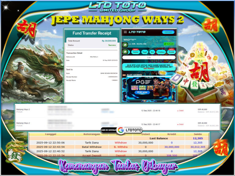 LTDTOTO JACKPOT MAHJONG WAYS 2 RP 30.000.000 SABTU 13 SEPTEMBER 2025 Selamat kepada User id : WAD**H** Telah berhasil mendapatkan kemenangan besar pada permainan MAHJONG WAYS 2, kemenangan Sebesar Rp.30.000.000, Setelah mengisi formulir withdraw dengan kurang waktu hanya 5 – 10 menit pihak LTDTOTO sudah melakukan transfer kepada pemilik User id dan dana sudah dapat di cairkan oleh pemenang. Bukti…