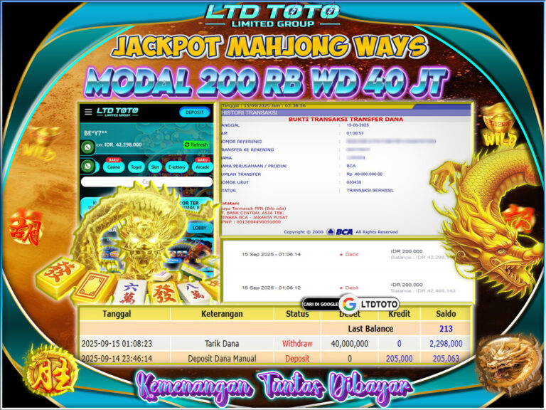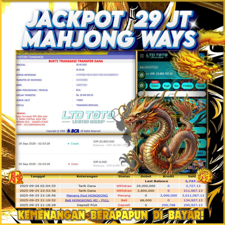 LTDTOTO JACKPOT SLOT MAHJONG WINS 3 BLACK SCATTER RP 20.000.000 RABU 17 SEPTEMBER 2025 Selamat kepada User id : RAGI*4** Telah berhasil mendapatkan kemenangan besar pada permainan MAHJONG WINS 3 BLACK SCATTER , kemenangan Sebesar Rp.20.000.000, Setelah mengisi formulir withdraw dengan kurang waktu hanya 5 – 10 menit pihak LTDTOTO sudah melakukan transfer kepada pemilik User id dan dana…