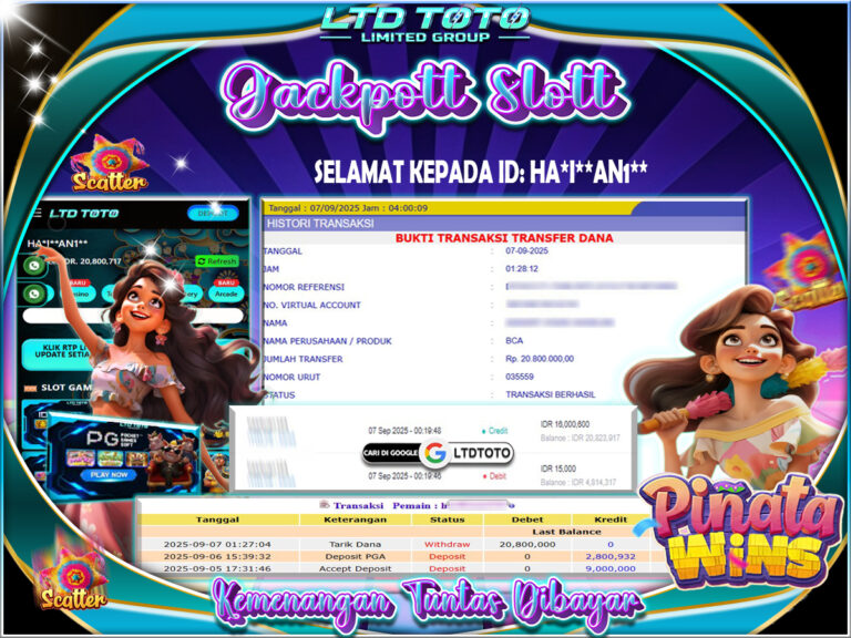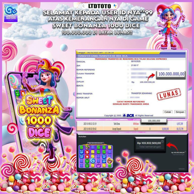 LTDTOTO JACKPOT SWEET BONANZA 1000 DICE POOLS RP 100.000.000 KAMIS 09 OKTOBER 2025 Selamat kepada User id : NYA**99 Telah berhasil mendapatkan kemenangan besar pada permainan SWEET BONANZA 1000 DICE , kemenangan Sebesar Rp.100.000.000, Setelah mengisi formulir withdraw dengan kurang waktu hanya 5 – 10 menit pihak LTDTOTO sudah melakukan transfer kepada pemilik User id dan dana sudah…