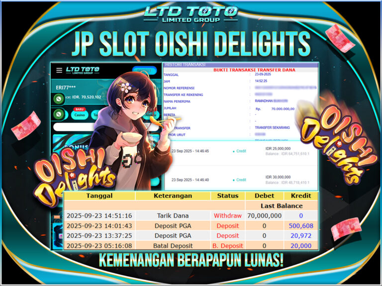 LTDTOTO JACKPOT SLOT OISHI DELIGHTS RP 70.000.000 SELASA 23 SEPTEMBER 2025 Selamat kepada User id : ERI77*** Telah berhasil mendapatkan kemenangan besar pada permainan SLOT OISHI DELIGHTS , kemenangan Sebesar Rp.70.000.000, Setelah mengisi formulir withdraw dengan kurang waktu hanya 5 – 10 menit pihak LTDTOTO sudah melakukan transfer kepada pemilik User id dan dana sudah dapat di cairkan oleh…