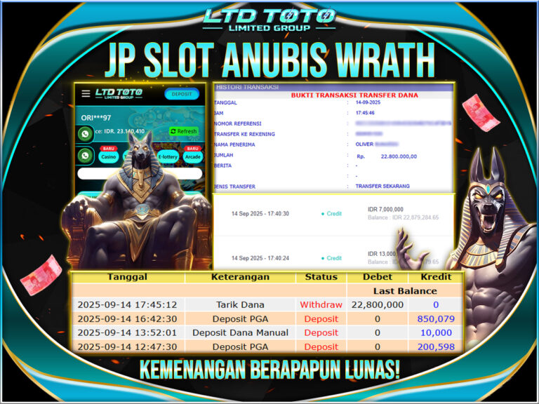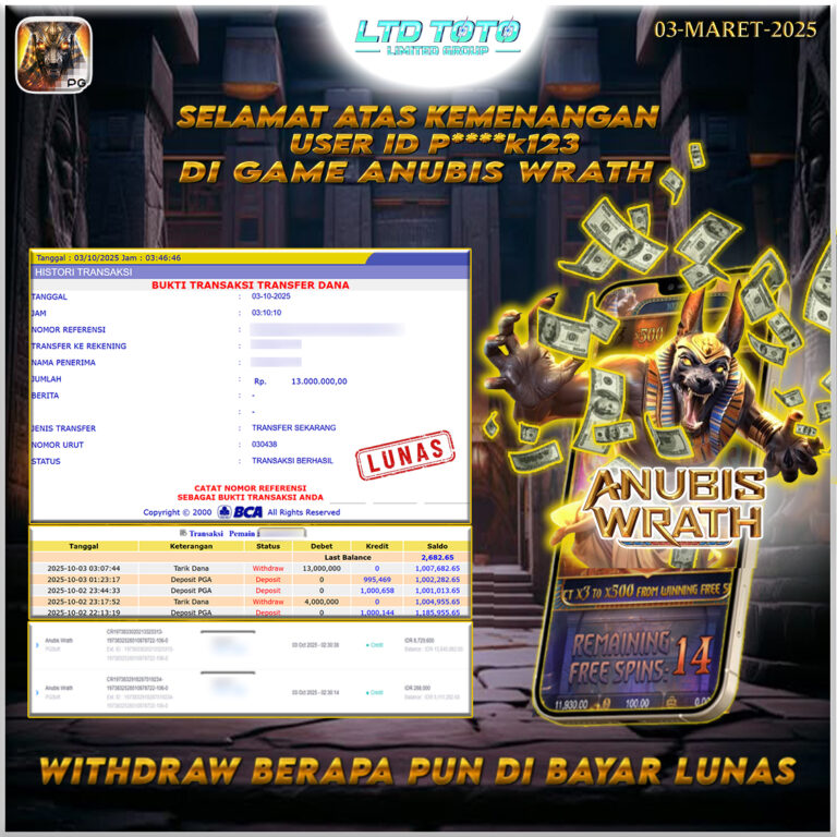 LTDTOTO JACKPOT WOLF GOLD RP 24.200.000 KAMIS 03 OKTOBER 2025 Selamat kepada User id : HURI*** Telah berhasil mendapatkan kemenangan besar pada permainan SLOT ANUBIS WRATH, kemenangan Sebesar Rp.13.000.000, Setelah mengisi formulir withdraw dengan kurang waktu hanya 5 – 10 menit pihak LTDTOTO sudah melakukan transfer kepada pemilik User id dan dana sudah dapat di cairkan oleh pemenang….