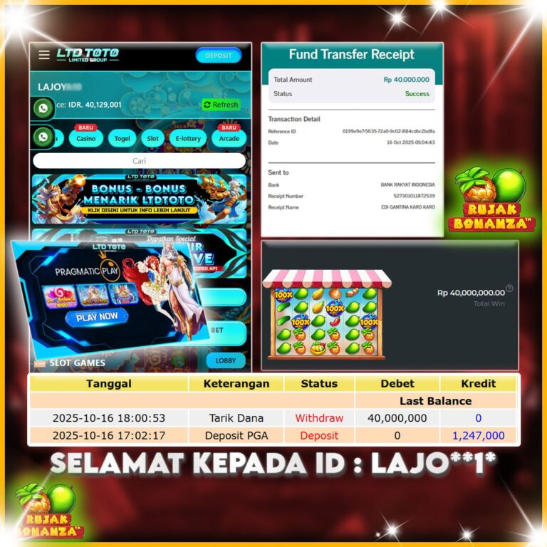 LTDTOTO JACKPOT RUJAK BONANZA RP 40.000.000 RABU 16 OKTOBER 2025 Selamat kepada User id : LAJOY*** Telah berhasil mendapatkan kemenangan besar pada permainan SLOT RUJAK BONANZA, kemenangan Sebesar Rp.40.000.000, Setelah mengisi formulir withdraw dengan kurang waktu hanya 5 – 10 menit pihak LTDTOTO sudah melakukan transfer kepada pemilik User id dan dana sudah dapat di cairkan oleh pemenang….