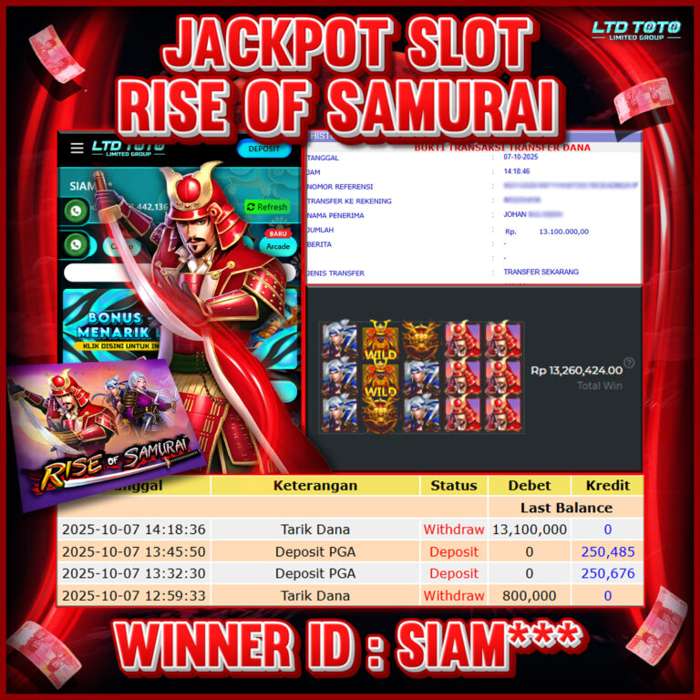 LTDTOTO RISE OF SAMURAI RP 13.100.000 SELASA 07 OKTOBER 2025 Selamat kepada User id : SIAM*** Telah berhasil mendapatkan kemenangan besar pada permainan SLOT RISE OF SAMURAI, kemenangan Sebesar Rp.13.100.000, Setelah mengisi formulir withdraw dengan kurang waktu hanya 5 – 10 menit pihak LTDTOTO sudah melakukan transfer kepada pemilik User id dan dana sudah dapat di cairkan oleh pemenang….