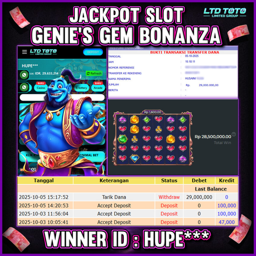 Selamat kepada User id : HUPE*** Telah berhasil mendapatkan kemenangan besar pada permainan SLOT GENIE’S GEM BONANZA, kemenangan Sebesar Rp.29.000.000, Setelah mengisi formulir withdraw dengan kurang waktu hanya 5 – 10 menit pihak LTDTOTO sudah melakukan transfer kepada pemilik User id dan dana sudah dapat di cairkan oleh pemenang. Bukti pembayaran yang kami berikan merupakan bukti pembayaran yang SAH / VALID yang langung di dapatkan melaui tanda transfer transaksi dari Bank yang di tuju. Kami mengucapakan banyak Terima Kasih Kepada pemenang karena sudah mempercayakan kami sebagai Bandar Tepercaya yang membayar semua kemenangan member hingga lunas. Masih ragu dengan LTDTOTO bos ? Di mana bandar togel online sekarang yang terpercaya seperti LTDTOTO? Bandar yang mengirimkan kemenangan member tanpa bertele – tele. Jadi…. tidak perlu khwatir pada situs LTDTOTO karena kemenangan anda berapapun akan dibayarakan hingga lunas kepada pemenang.