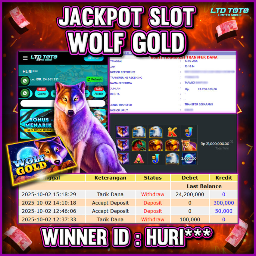 Selamat kepada User id : HURI*** Telah berhasil mendapatkan kemenangan besar pada permainan SLOT WOLF GOLD, kemenangan Sebesar Rp.24.200.000, Setelah mengisi formulir withdraw dengan kurang waktu hanya 5 – 10 menit pihak LTDTOTO sudah melakukan transfer kepada pemilik User id dan dana sudah dapat di cairkan oleh pemenang. Bukti pembayaran yang kami berikan merupakan bukti pembayaran yang SAH / VALID yang langung di dapatkan melaui tanda transfer transaksi dari Bank yang di tuju. Kami mengucapakan banyak Terima Kasih Kepada pemenang karena sudah mempercayakan kami sebagai Bandar Tepercaya yang membayar semua kemenangan member hingga lunas. Masih ragu dengan LTDTOTO bos ? Di mana bandar togel online sekarang yang terpercaya seperti LTDTOTO? Bandar yang mengirimkan kemenangan member tanpa bertele – tele. Jadi…. tidak perlu khwatir pada situs LTDTOTO karena kemenangan anda berapapun akan dibayarakan hingga lunas kepada pemenang.
